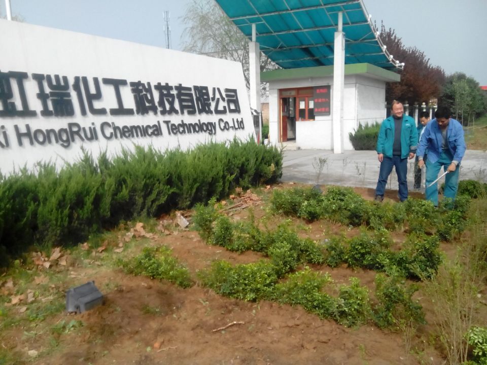 (马师傅创意性地在大门口两侧拼出“HRKJ”——虹瑞科技拼音缩写字样,获众人称赞)