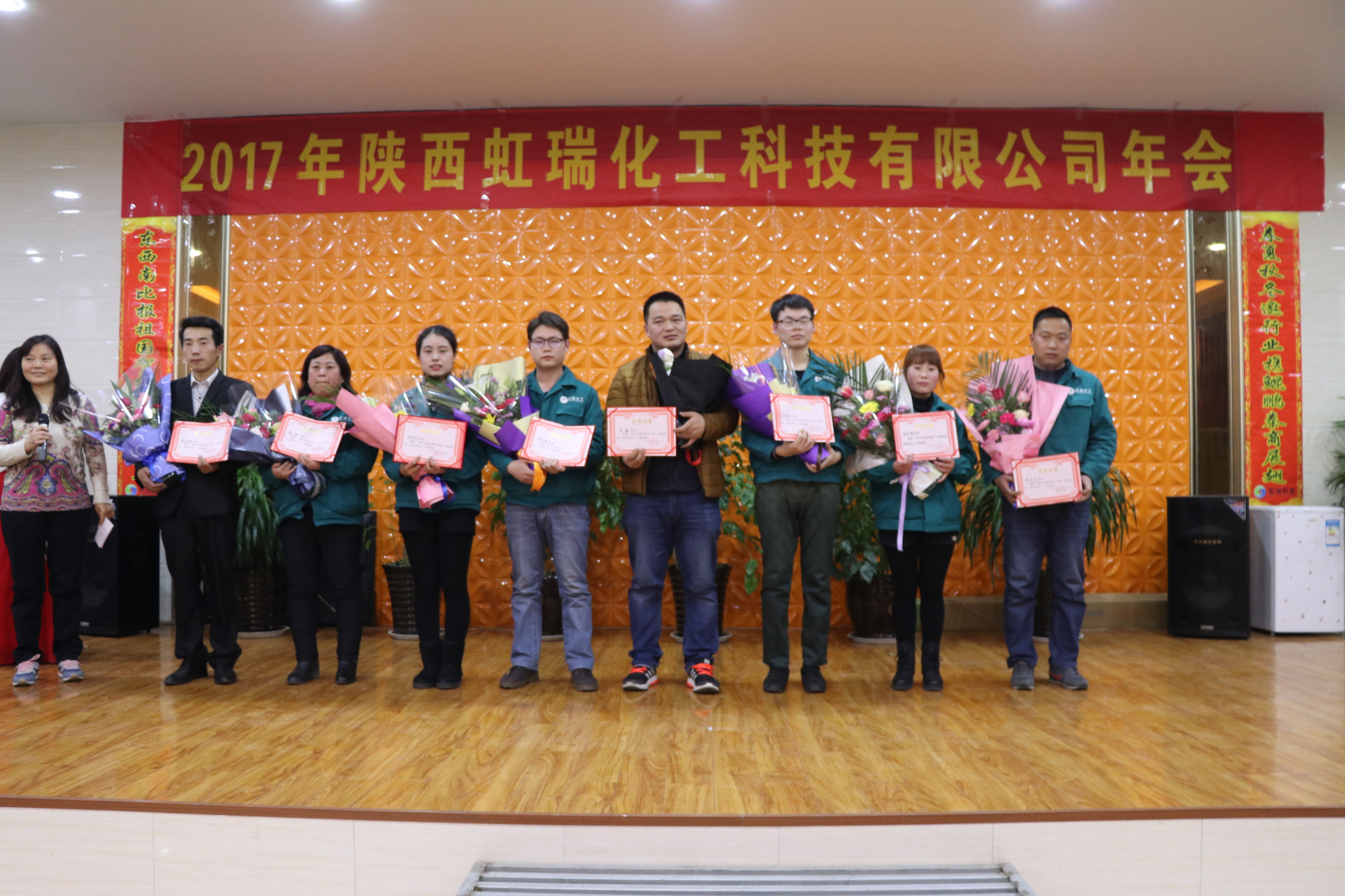 2017年公司年会特别报道 时光飞逝,岁月如梭,转眼间忙碌的2016年已过去,充满期待的2017年向我们走来。新的一年,孕育新的目标和希望。星空官网登录入口(中国)官方网站2017年新年年会隆重举行,公司全体员工,欢聚一堂,共度联欢。公司总经理王涛和大家一起参加公司年会,同时还有礼泉县北山五交化采供站的兄弟姐妹们也从礼泉县赶来一起参加活动。 公司营销总经理李华先生致新春贺词,并向公司和大家送上对新年的祝福,同时也对2016年的工作做了一个总结,为我们2017年经营目标的完成加油打气。此次联欢会各部门员工带来了形式各异、让人目不暇接的表演,舞蹈、唱歌、手语操、走秀等节目,精彩纷呈。中间还穿插了抽奖环节,随着、幸运奖、三等奖、二等奖、一等奖的抽取,不断掀起年会的高潮。联欢会不仅给大家带来了欢声笑语,同时也让同事之间彼此的心更加贴近。公司领导与员工亲情互动、激动人心的抽奖活动,让歌声、掌声、欢呼声一直在会场上荡漾。整场联欢会高潮迭起,呈现虹瑞这个大家庭的欢乐和谐。 随后主持人宣读了“星空官网登录入口(中国)官方网站2016年度表彰决定”,对优秀员工、先进团队、安全个人、新人成长、功勋人物五个奖项二十余名员工进行表彰,号召全体员工向他们学习,学习他们在各自岗位上尽职尽责、任劳任怨,特别是舍小我顾大局的团队精神!公司领导为优秀员工和先进团队颁发了证书和奖品,鼓励他们戒骄戒躁,在新的一年起到模范带头作用,做出新的贡献。 光辉灿烂的2016年已经过去,充满希望和挑战的2017悄然来临。在过去的一年里我们微笑过、艰难过、也收获过,面对2017,我们满怀憧憬,激情澎湃,让我们一起用信心和勇气,昂首阔步,去书写一个更加灿烂的未来。 主持人风采